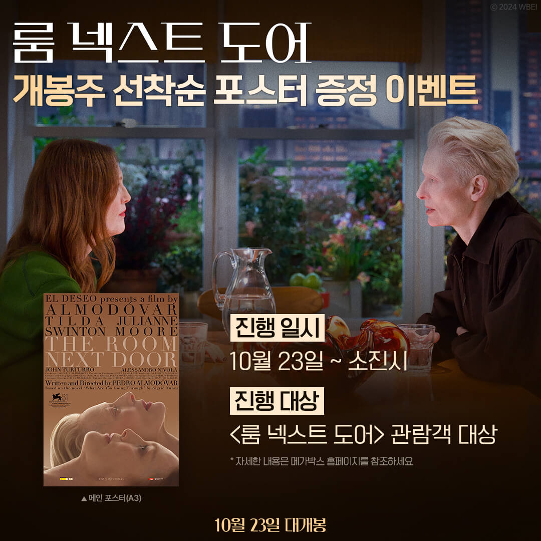 2024년 9월 2일 제81회 베니스 국제 영화제 경쟁 부문 초청작이자 황금사자상 수상작인 '룸 넥스트 도어'는 스페인에서 2024년 10월 18일에 개봉되었으며, 한국에서는 10월 23일 메가박스 단독 개봉됩니다.