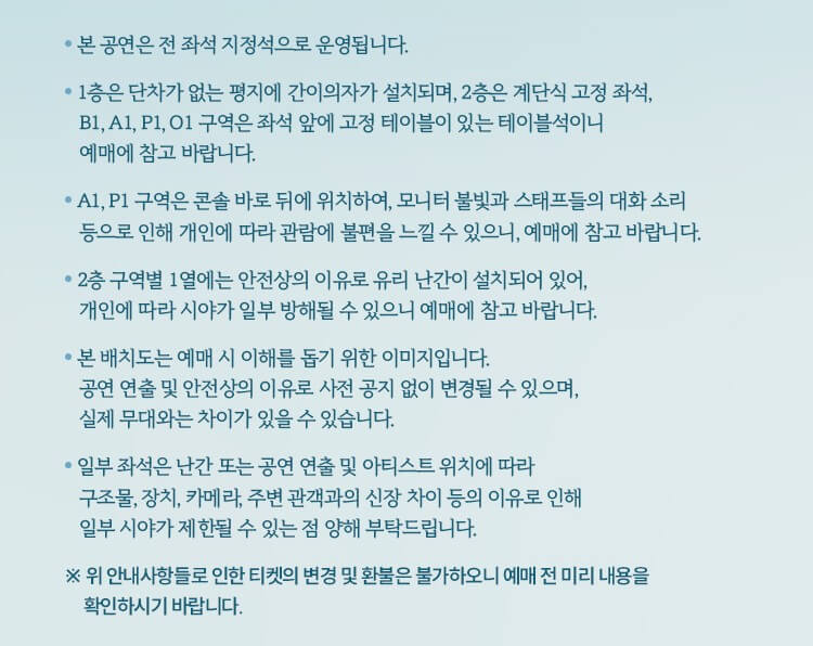 - 공연 중 사진/영상 촬영이 제한될 수 있으므로, 예매처에 공지된 관람 규정도 사전에 꼭 확인이 필요합니다.