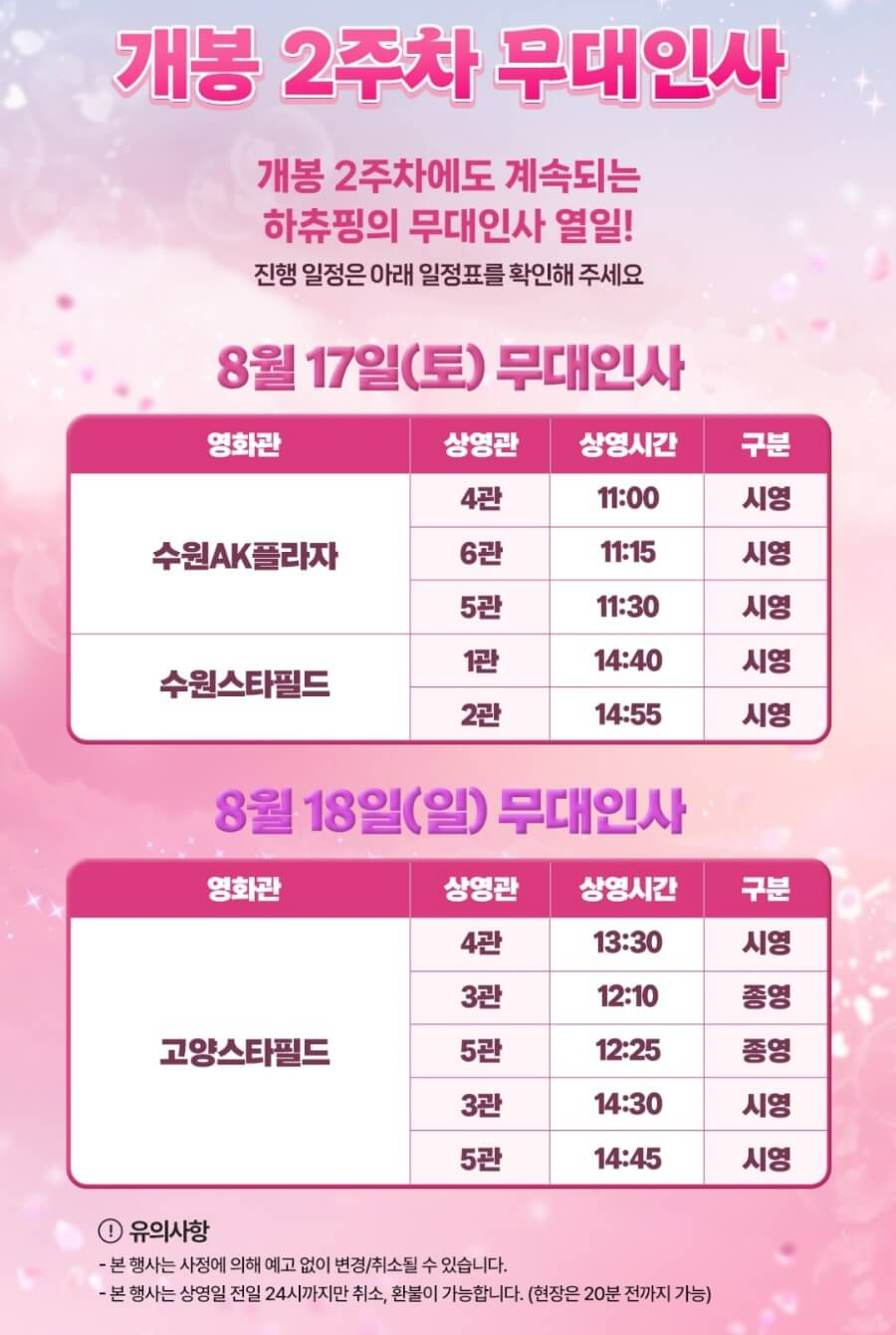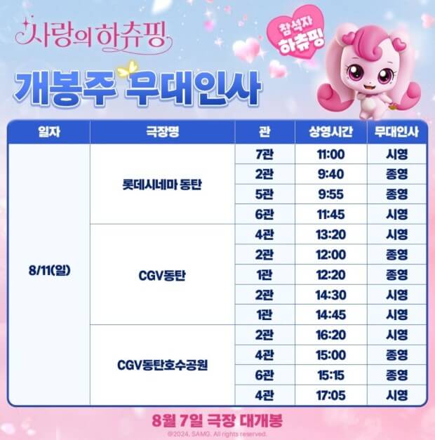 영화 '사랑의 하츄핑' 무대인사는 개봉 첫 주와 두 번째 주 동안 다양한 극장에서 진행될 예정입니다. 영화 무대인사에서는 주연 성우 및 제작진이 관객들과 직접 만나는 시간을 가지며, 특별한 이벤트와 선물도 제공됩니다.