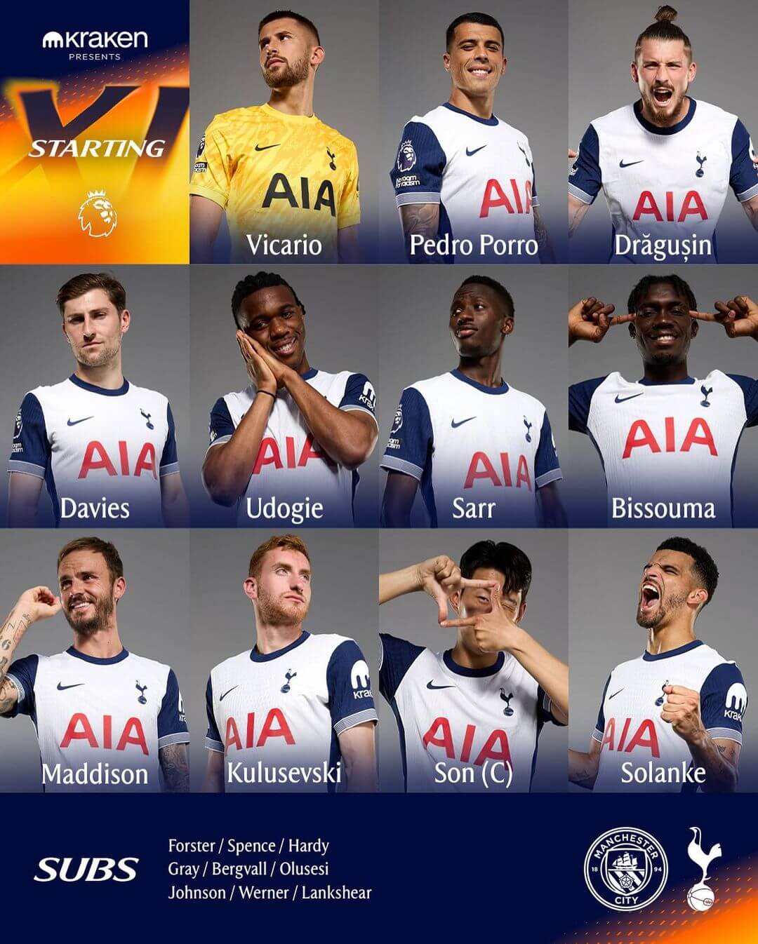 토트넘은 엔제 포스테코글루 감독의 지휘 아래 4-2-3-1 포메이션을 채택했습니다. 골키퍼로는 굴리엘모 비카리오가 출전하였으며, 수비 라인은 페드로 포로, 라두 드라구신, 벤 데이비스, 데스티니 우도기로 구성되었습니다.