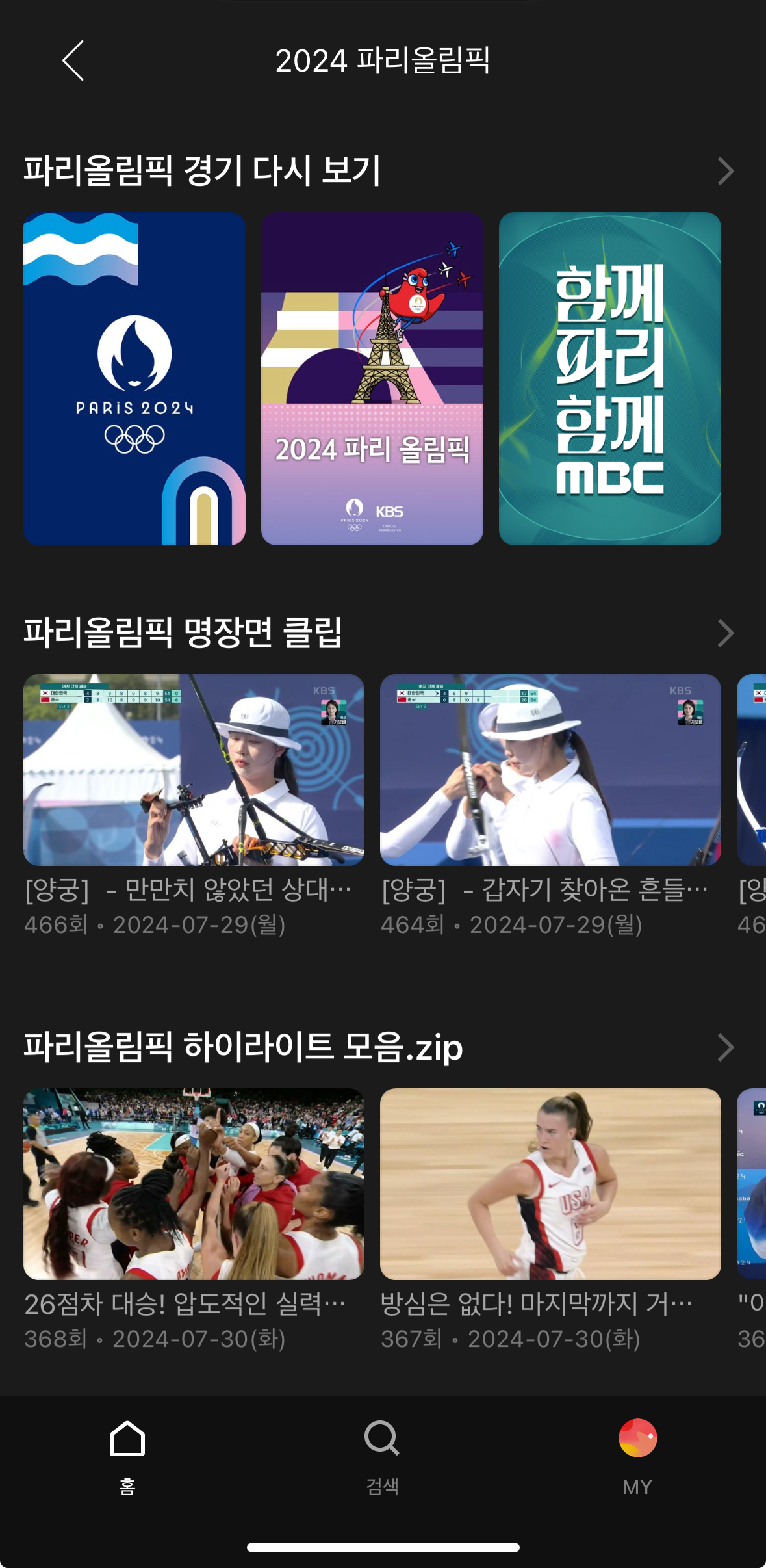- 주요 장면 선택 : 파리 주요 영상, 종목별 영상, 방송사별 영상 중에서 원하는 하이라이트를 시청할 수 있습니다.