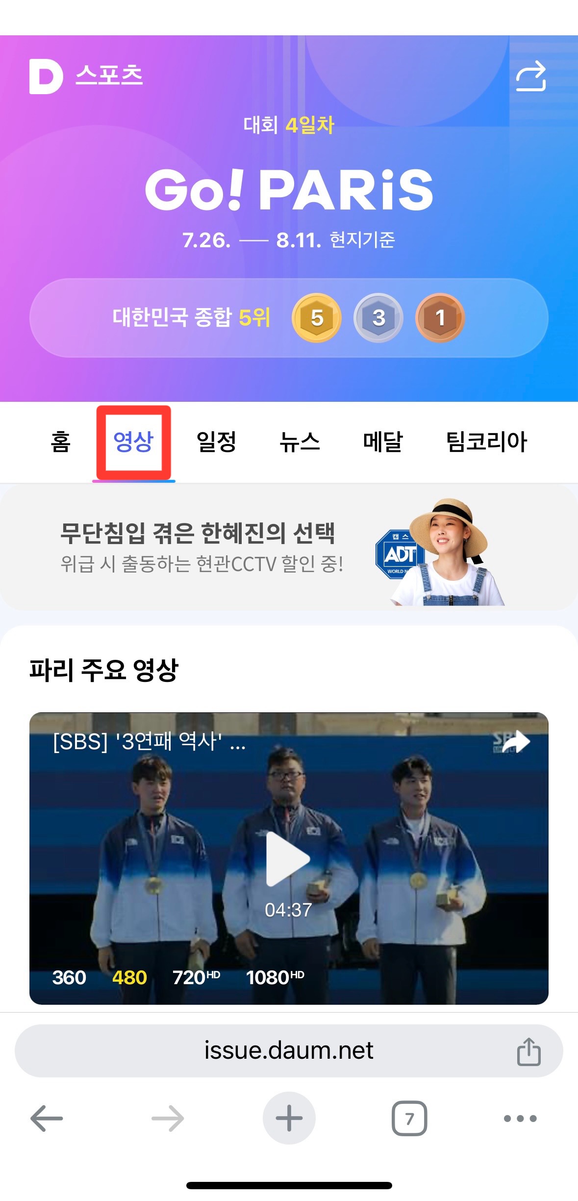 - 올림픽 Go! PARiS 페이지 접속 : 다음 올림픽 메인 화면에서 Go! PARiS 아이콘 하단에 위치한 "대회 하이라이트"를 클릭하여 2024 파리올림픽 전용 페이지로 이동합니다.