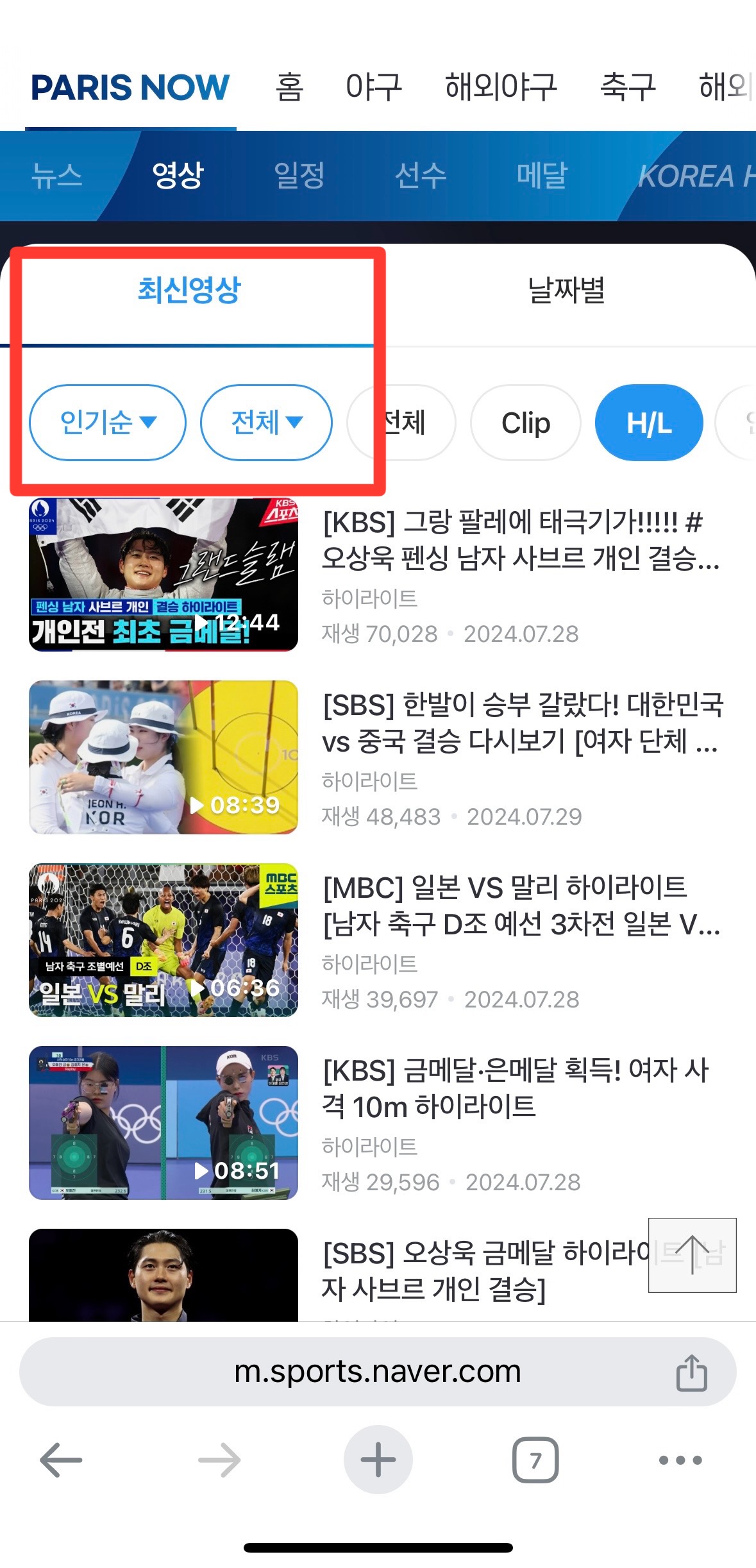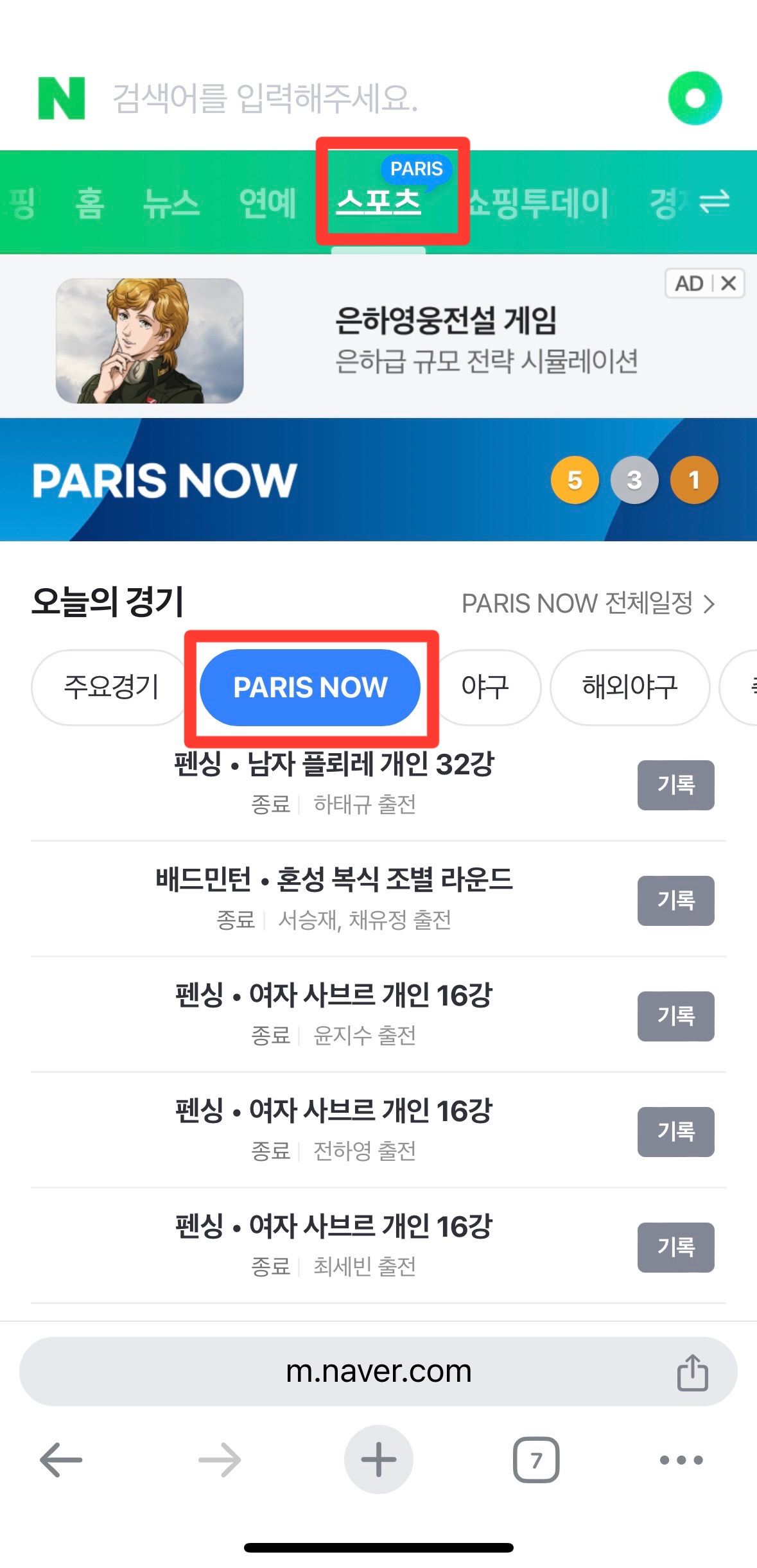 - PARIS NOW 페이지 접속 : 네이버 스포츠 메인 화면에서 "PARIS NOW" 아이콘을 클릭하여 2024 파리올림픽 전용 페이지로 이동합니다.