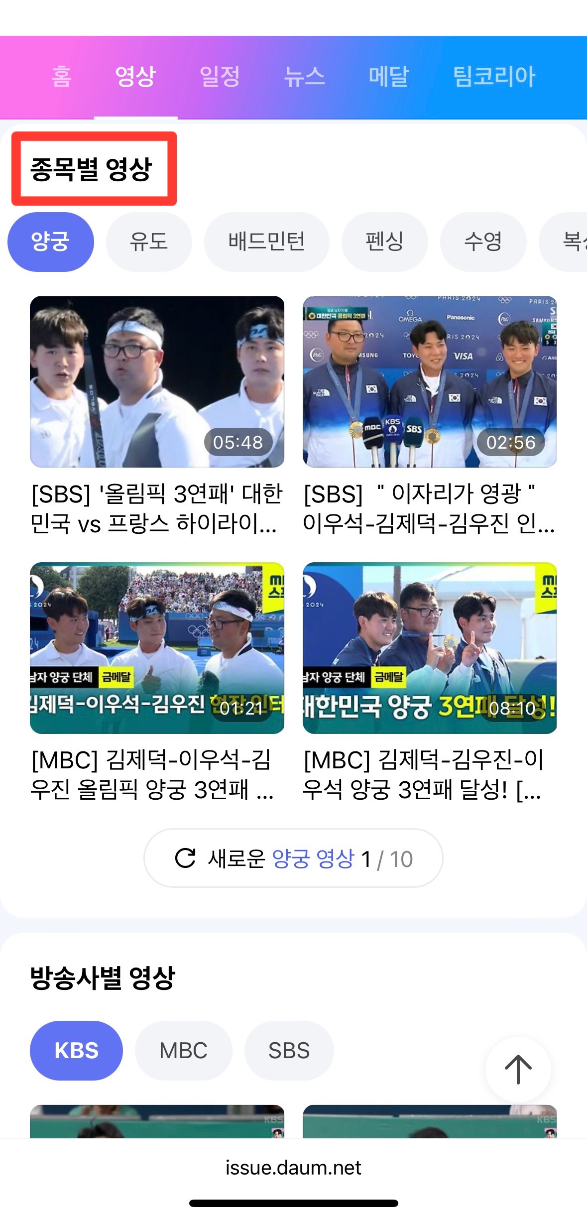 3. 주요 장면 선택 : 파리 주요 영상, 종목별 영상, 방송사별 영상 중에서 원하는 하이라이트를 시청할 수 있습니다.