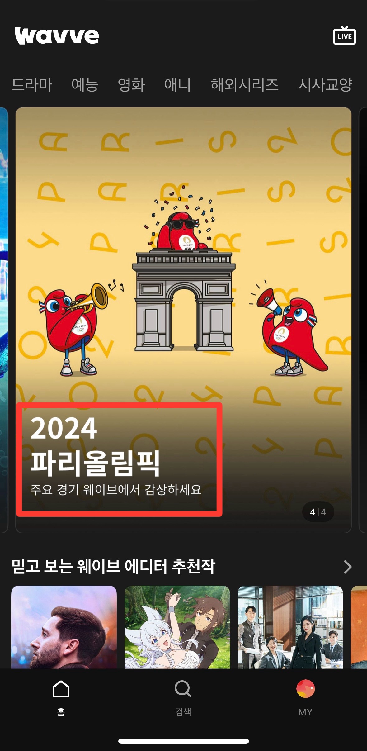 - 웨이브 앱 또는 홈페이지 접속 : 웨이브 유료 구독권이 있는 경우 시청이 가능하며, 웨이브 앱에 접속합니다.