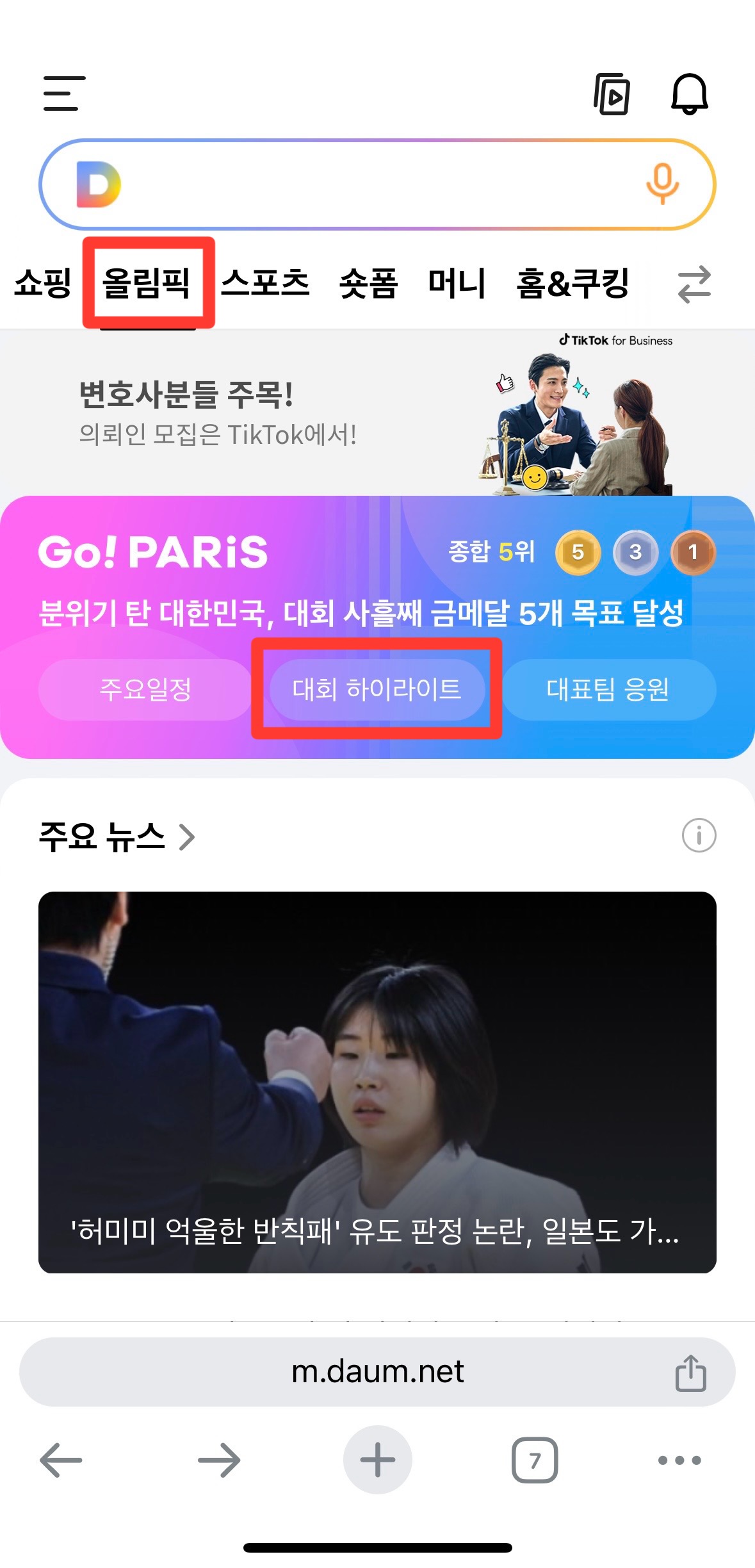 1. 올림픽 Go! PARiS 페이지 접속 : 다음 올림픽 메인 화면에서 Go! PARiS 아이콘 하단에 위치한 "대회 하이라이트"를 클릭하여 2024 파리올림픽 전용 페이지로 이동합니다.
