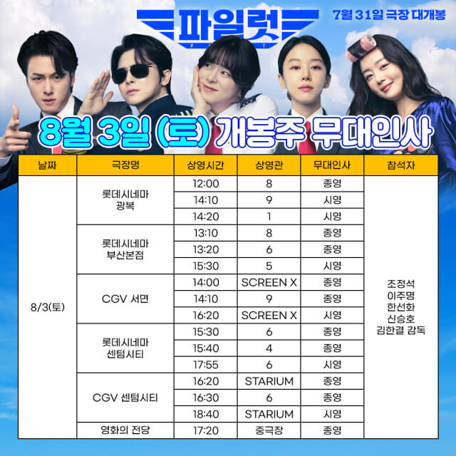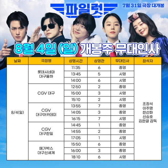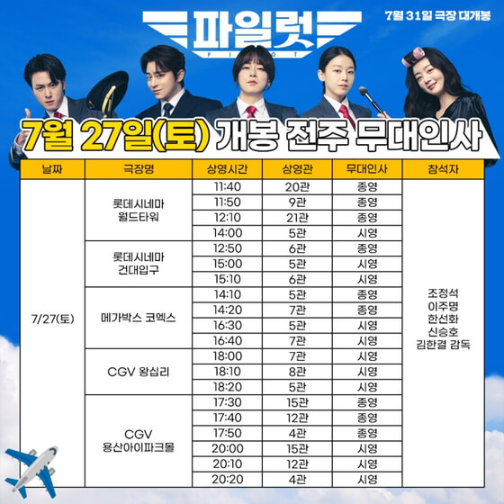 '파일럿' 무대인사는 배우 조정석, 이주영, 한선화, 신승호, 그리고 김한결 감독이 참석하여 관객들과 직접 만남을 가집니다. 무대인사 일정은 7월 31일 개봉 전주인 7월 27일과 7월 28일, 그리고 개봉일 7월 31일, 개봉주인 8월 3일, 8월 4일에 무대인사를 진행할 예정입니다.