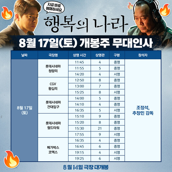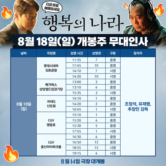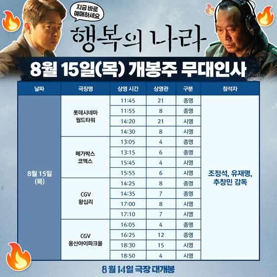 영화 '행복의 나라'는 개봉 첫 주에 광복절과 주말 동안 무대인사를 진행합니다. 무대인사는 8월 15일 광복절에 롯데시네마 월드타워를 시작으로 메가박스 코엑스, CGV 왕십리, CGV 용산아이파크몰에서 진행됩니다.