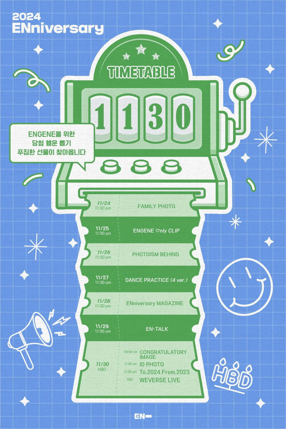 2024년 11월 23일, 그룹 엔하이픈(ENHYPEN)이 데뷔 4주년을 맞아 '2024 ENniversary' 타임테이블을 공개했습니다.