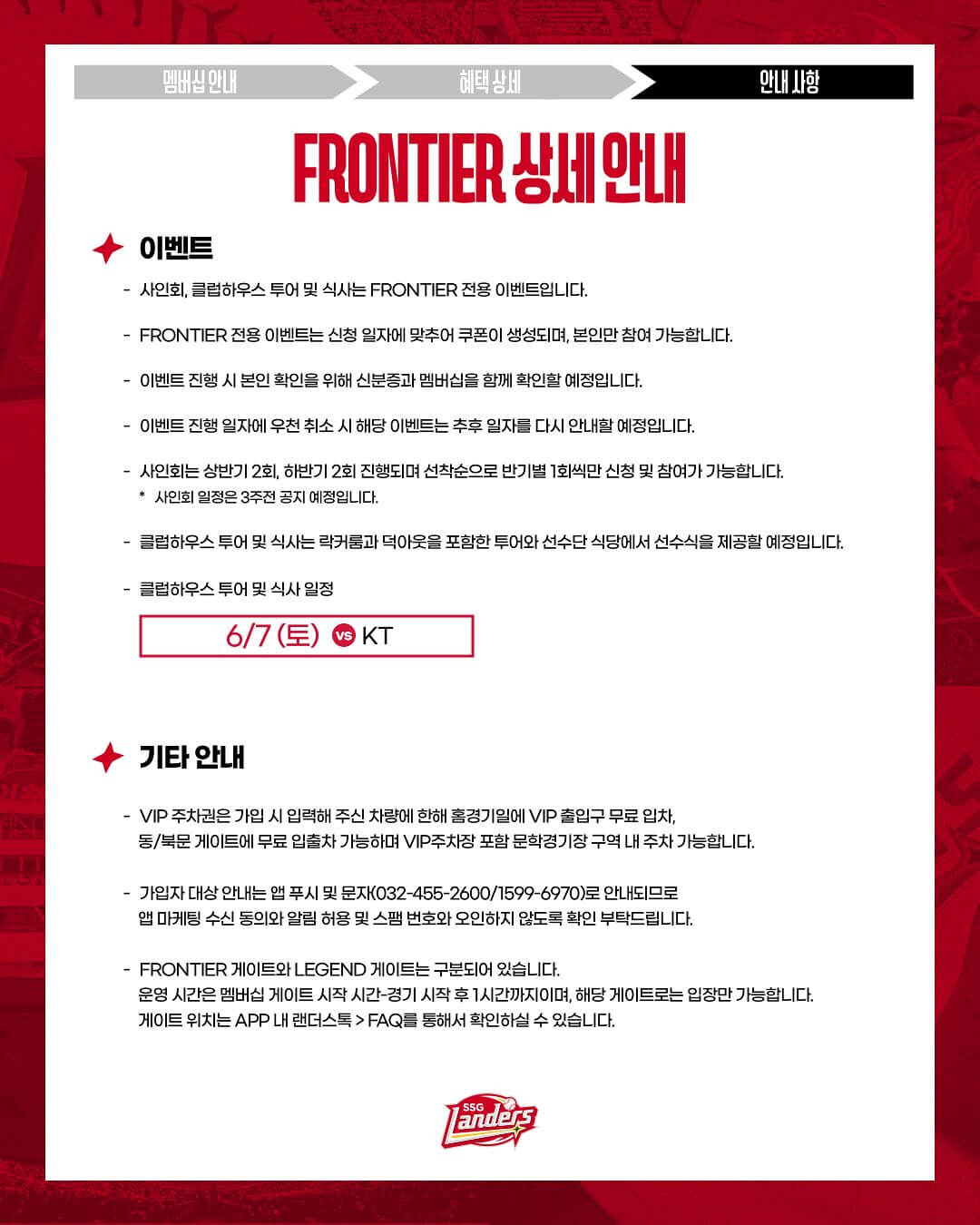 - Frontier 멤버십: 선착순 150명 한정으로, 다른 등급보다 1시간 빠른 선예매, Legend 등급 선물, 레드퍼레이드 및 어메이징로드 참여, 사인회 2회, 클럽하우스 투어 및 식사 등 선수들과의 프리미엄 이벤트 참여 기회, 전용 게이트 선입장, VIP 주차권 또는 2층 테이블석 2매 선택권 등이 주어집니다.