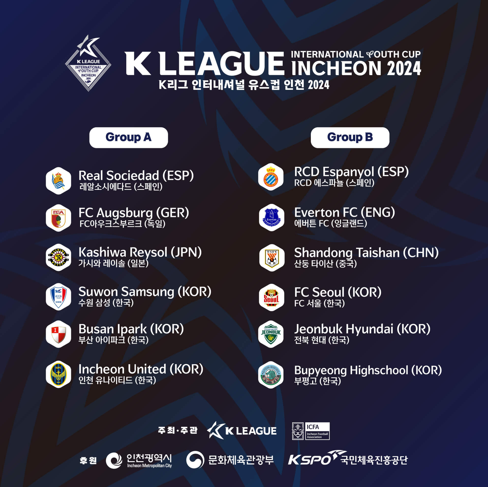 A조는 레알 소시에다드, FC 아우크스부르크, 가시와 레이솔, 수원 삼성, 부산 아이파크, 인천 유나이티드로 구성되었고, B조는 RCD 에스파뇰, 에버튼 FC, 산둥 타이산, FC 서울, 전북 현대, 부평고가 속해 있습니다.